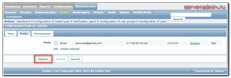 Нажимаем Update. Затем в разделе Media пользователя Admin еще раз жмем Update для применения настроек: