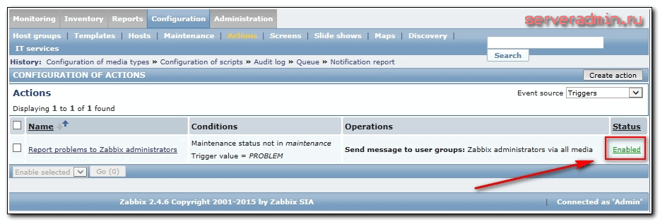 Теперь последний штрих, который лично я частенько забываю сделать, а потом долго разбираюсь, почему zabbix не отправляет оповещения на почту. Идем в раздел Configuration -> Actions и в единственной строке Report problems to Zabbix administrators жмем на Disabled в столбце статус, чтобы он стал Enabled: