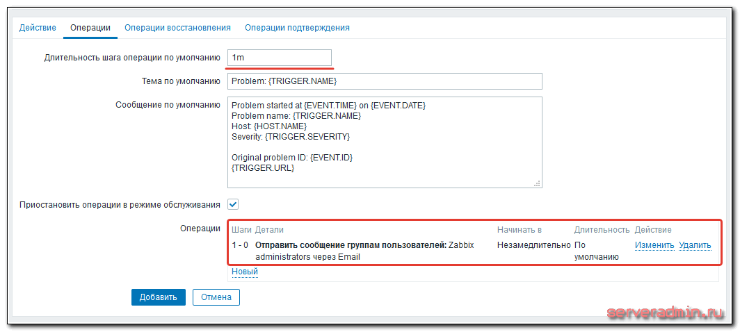 Тут же можете шаблоны поправить так, как вам нравится. Это нововведение 5-й версии Zabbix – правка шаблонов оповещений в настройках самих оповещений. Это позволяет создавать для каждого типа свои шаблоны. Очень удобно.