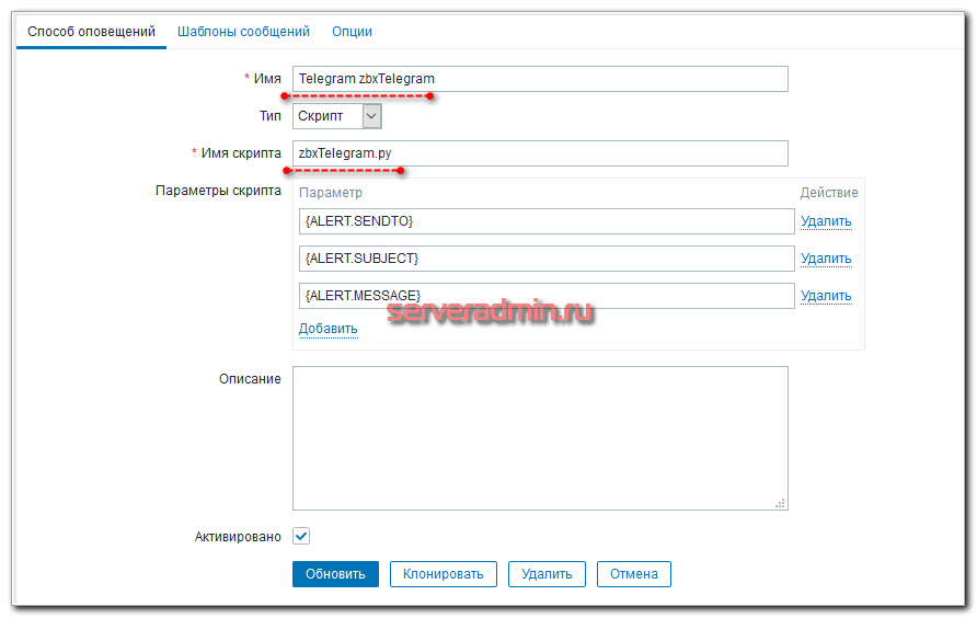 В url на конце должен обязательно быть слеш. Дальше делаем все то же самое, что и ранее. Идем в Способы оповещений и добавляем новый тип, где в качестве скрипта указываем zbxTelegram.py.