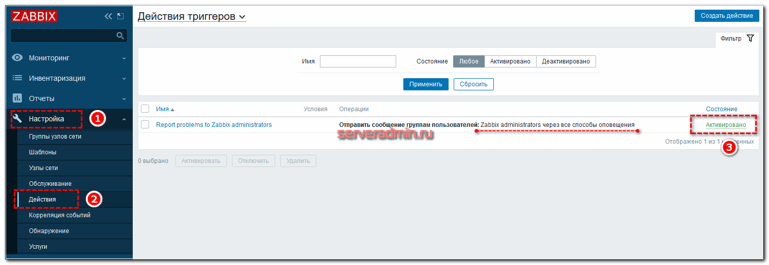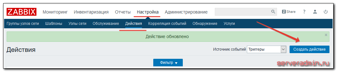 Теперь нам необходимо создать так называемое “Действие”, которое при определенных условиях будет использовать наш способ оповещения. Для этого нам нужно перейти на вкладку “Настройка” и в появившейся строке нажать на кнопку “Действия”, как показано на скриншоте ниже.