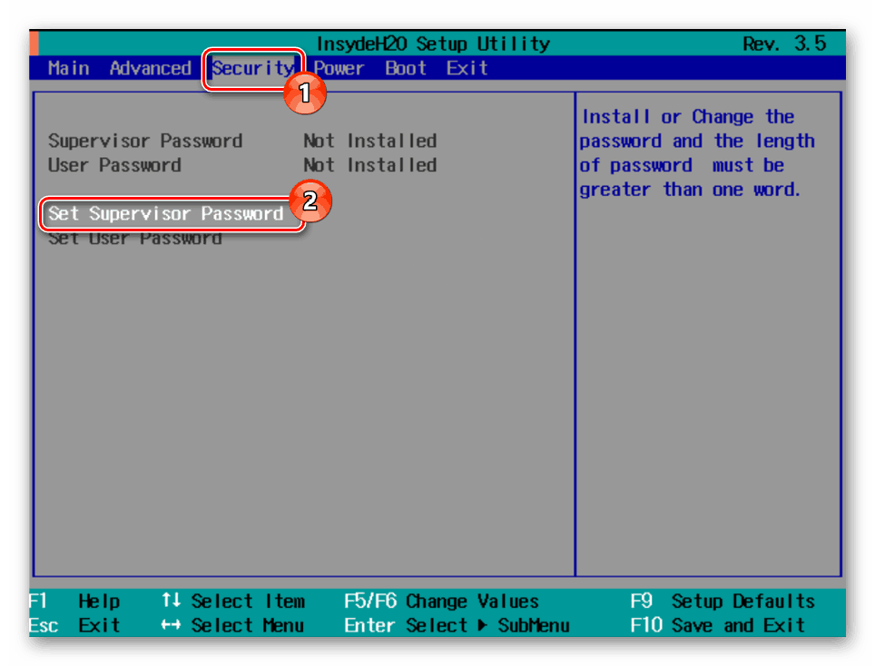 - Откройте BIOS и через верхнее меню перейдите на вкладку «Security».