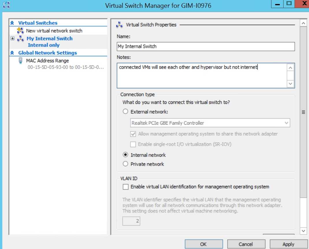 Тип коммутатора vSwitch определяется параметром “-SwitchType «Internal/Private» или в случае внешнего vSwitch одним из следующих параметров: “-NetAdapterName «имя физического сетевого адаптера» / -NetAdapterInterfaceDescription «описание физического сетевого адаптера»”.