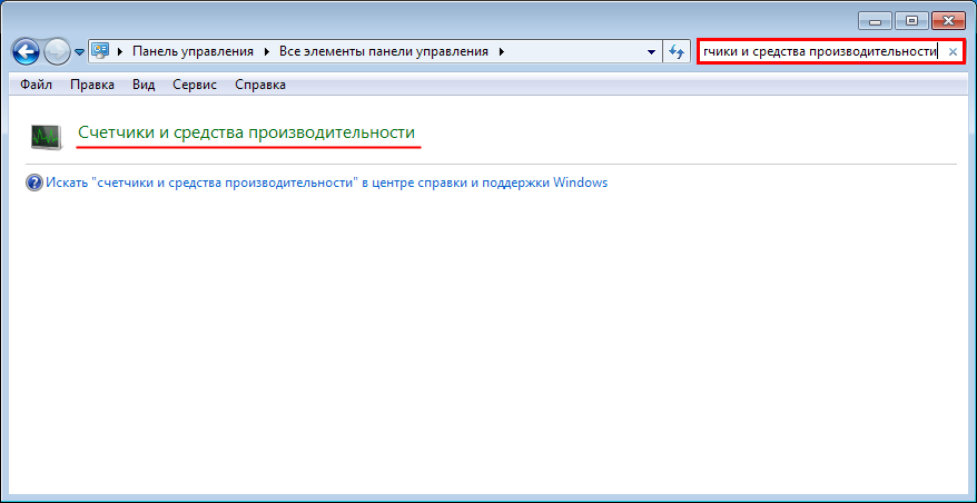 - Откройте раздел «Счетчики и средства производительности». Для этого нажмите кнопку Пуск и выберите компонент Панель управления. В поле поиска введите Счетчики и средства производительности, а затем в списке результатов выберите пункт Счетчики и средства производительности.