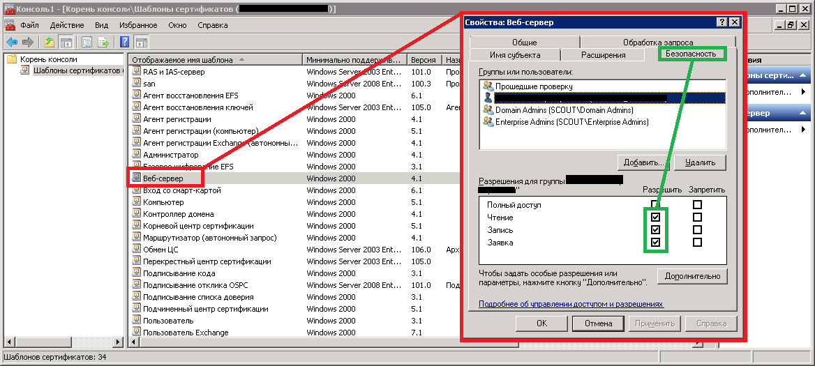 Вот тут начинается самое интересное. Нужно выбрать шаблон сертификата «Веб-сервер», но в выпадающем списке у меня его не было! Причина крылась в правах: сеанс браузере был открыт из под пользователя без прав администратора домена или администратора организации. Почему-то по легкому пути (открыть браузер под админом домена) я не пошел, у меня даже не возникло такой мысли и я решил таки выдать права нужному юзеру. Для этого на сервере сертификации заходим в оснастку «Шаблоны сертификатов» и ищем шаблон «Веб-сервер». После чего в свойствах даем необходимые права вашей учетке: