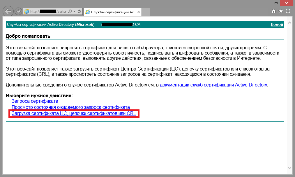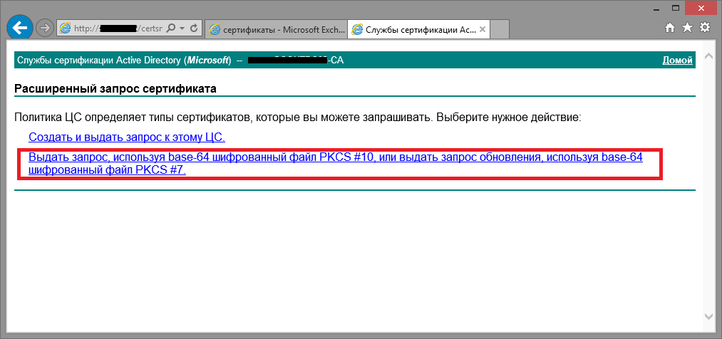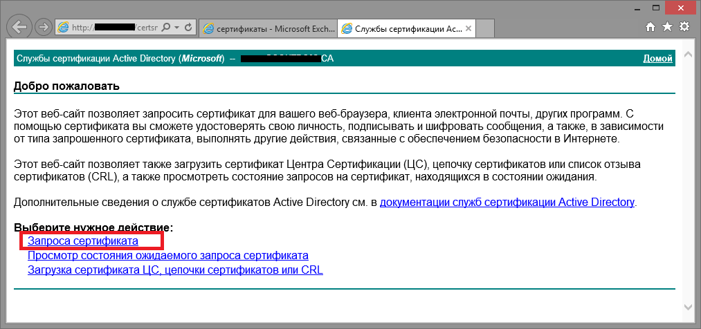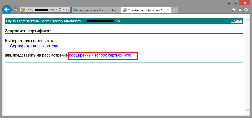 Снова заходим на стартовую страницу центра сертификации теперь уже для получения сертификата Exchange 2013. Идем по порядку как на скриншотах: