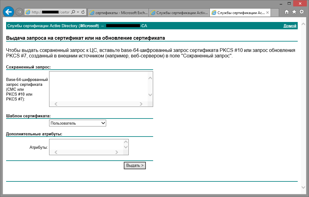Выпуск сертификата для Exchange