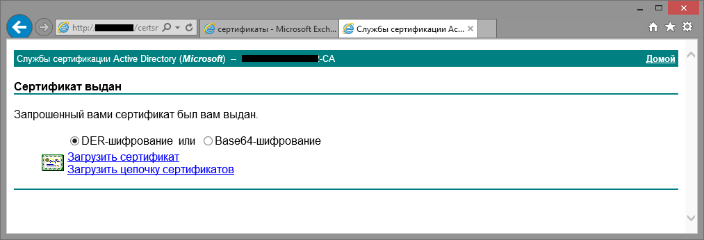 Завершение выпуска сертификата Exchange