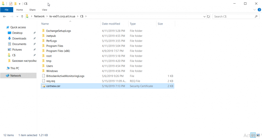 Загружаем сертификат в корень системного диска Exchange сервера: