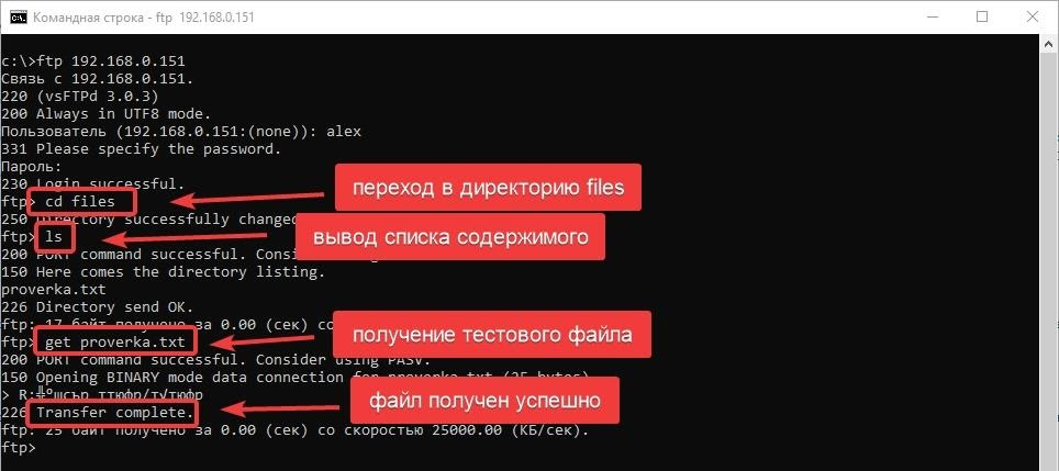 Перейдем в директорию files и скачаем наш тестовый файл proverka.txt, для этого необходимо ввести команду cd files для перехода в директорию files, после чего ввести команду ls для вывода списка содержимого данной директории и затем get proverka.txt для скачивания файла.