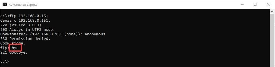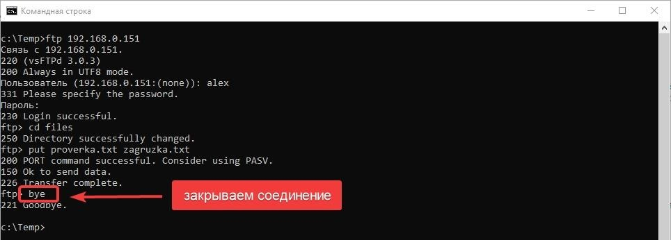 Закроем соединение и выйдем с FTP сервера введя команду bye: