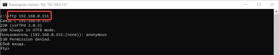 Мы настроили наш FTP сервер так, чтобы разрешить подключения только пользователю alex. Мы отключили анонимный FTP доступ, давайте проверим это, попытавшись подключиться анонимно. Если конфигурация настроена правильно, анонимным пользователям будет отказано в доступе на FTP сервер. Откройте еще одно окно командной строки и выполните команду для подключения к серверу по протоколу FTP — ftp 192.168.0.151. Обязательно замените 192.168.0.151 на публичный IP-адрес вашего сервера: