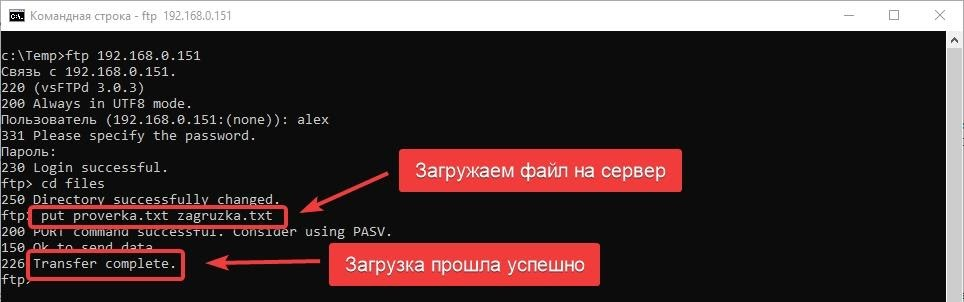 Теперь попробуем закачать файл на FTP сервер с новым именем, чтобы проверить работоспособность загрузки и права на запись. Для загрузки файла на ФТП сервер необходимо после подключения ввести команду put proverka.txt zagruzka.txt, где proverka.txt имя нашего файла который у нас существует, а zagruzka.txt это имя файла под которым он будет загружен на сервер: