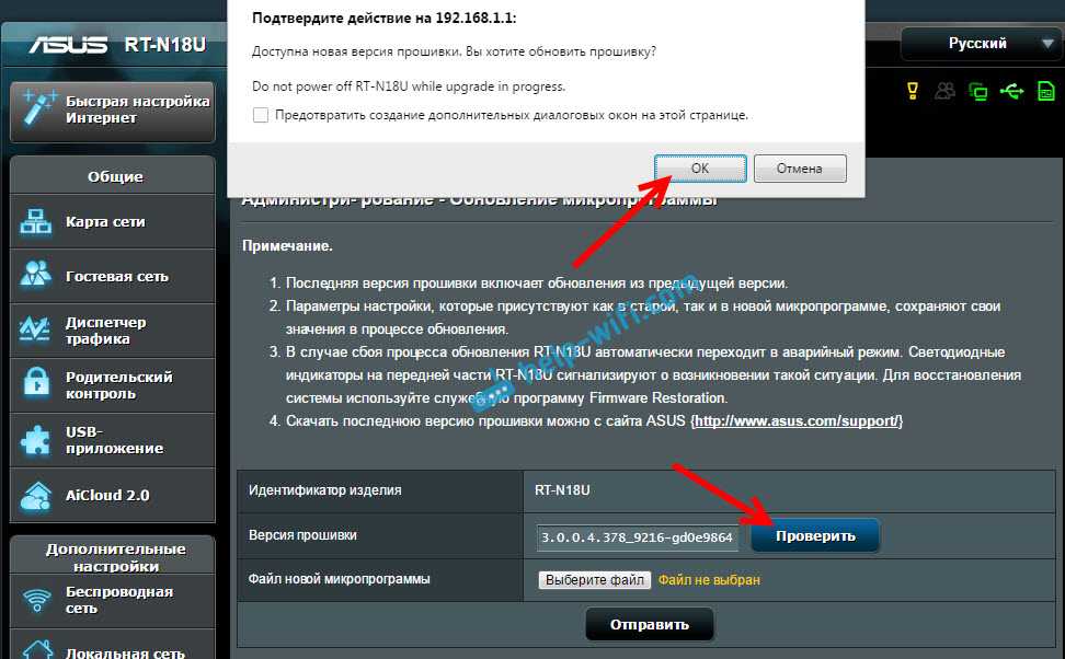 Или, перейдите на вкладку «Администрирование» – «Обновление микропрограммы», и нажмите на кнопку «Проверить». Если есть новое ПО, то снова же появится окно с подтверждением. Нажимаем Ok, если хотите обновить свой ASUS.
