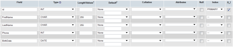 CREATE TABLE persons ( id INT NOT NULL PRIMARY KEY AUTO_INCREMENT, name VARCHAR(50) NOT NULL, birth_date DATE, phone VARCHAR(15) NOT NULL UNIQUE );