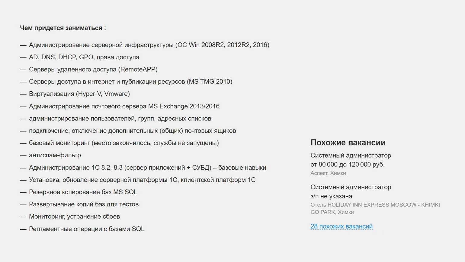 - Средний и крупный бизнес. Здесь системные администраторы являются штатными сотрудниками. Вакансии можно искать на HH.ru.