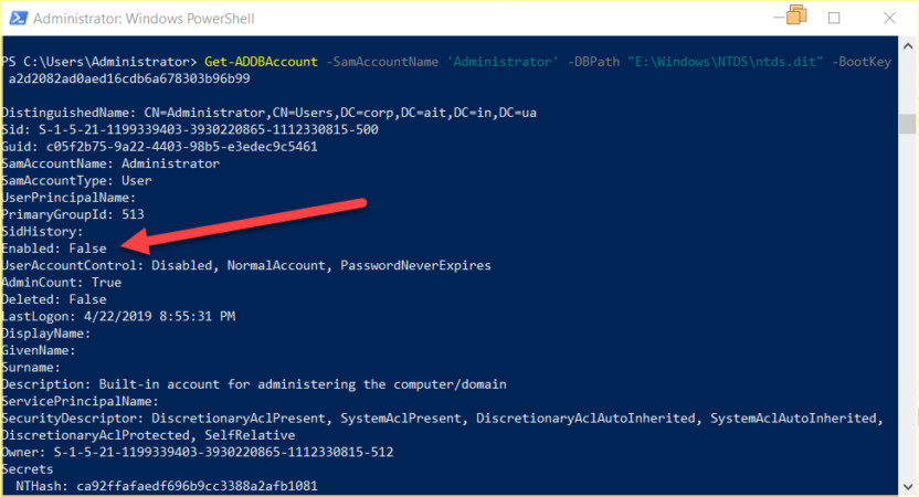 Get-ADDBAccount -SamAccountName ‘Administrator’ -DBPath «E:\Windows\NTDS\ntds.dit» -BootKey a2d2082ad0aed16cdb6a678303b96b99