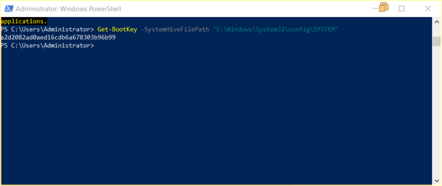 | 1 | Get-BootKey-SystemHiveFilePath»E:\Windows\System32\config\SYSTEM» |