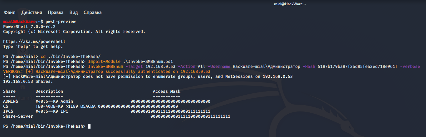 Invoke-SMBEnum -Target 192.168.0.53 -Action All -Username HackWare-mial\Администратор -Hash 5187b179ba87f3ad85fea3ed718e961f -verbose