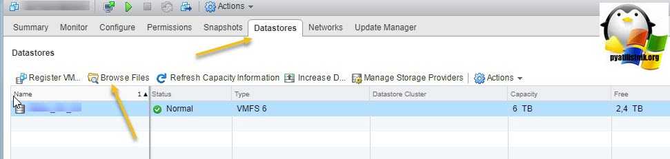 Далее я иду на датастор на котором находится виртуальная машина с общими дисками (Datastore — Browse Files).