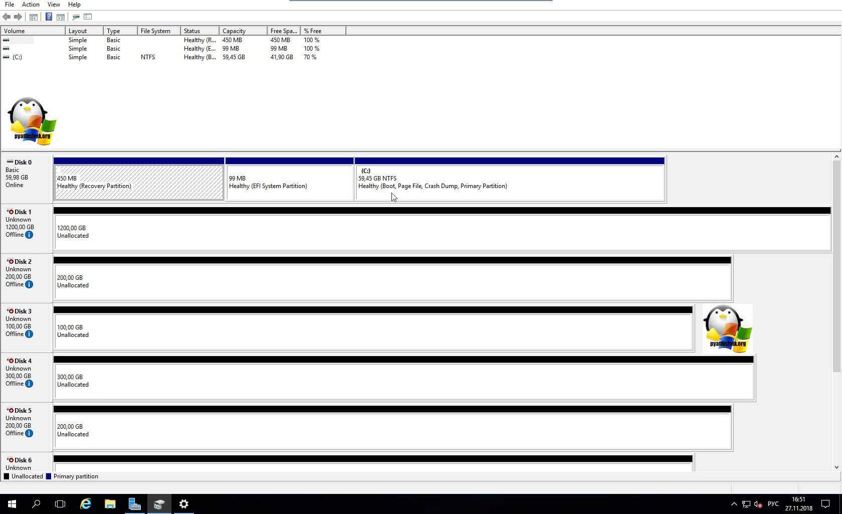 Далее уже в операционной системе Windows Server, зайдя в оснастку «Управление дисками» вы обнаружите ваши диски. Остается их только разметить в GPT формат и отдать под кластер.