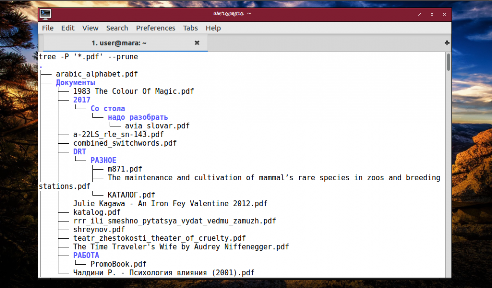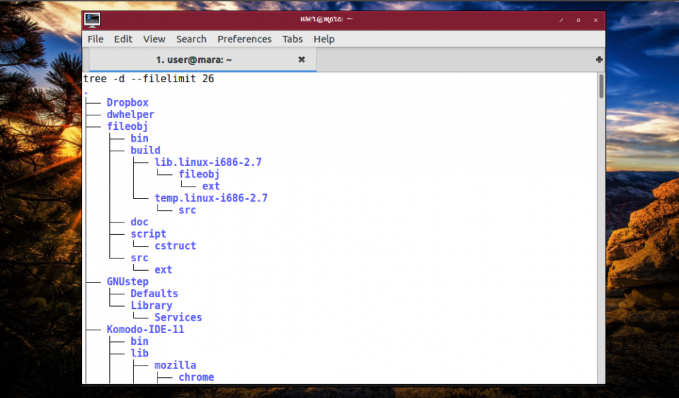 Немного сократить объем информации можно, попросив команду показывать только папки. Для этого служит опция -d. А чтобы отпилить от дерева еще больше ненужных веток, установим ограничение на количество файлов, которые хранятся в папках (если файлов больше, папка не попадет в выдачу). В этом нам поможет опция —filelimit.