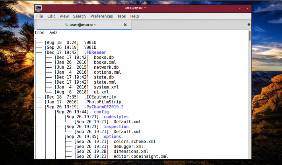 По умолчанию команда tree в linux не показывает скрытые папки. Чтобы увидеть их, следует воспользоваться опцией -a. Заодно не помешает упорядочить выдачу — например, по уровням вложенности (параметр -v). Ну и почему бы не узнать, когда тот или иной файл был изменен последний раз — добавим к команде еще и -D.