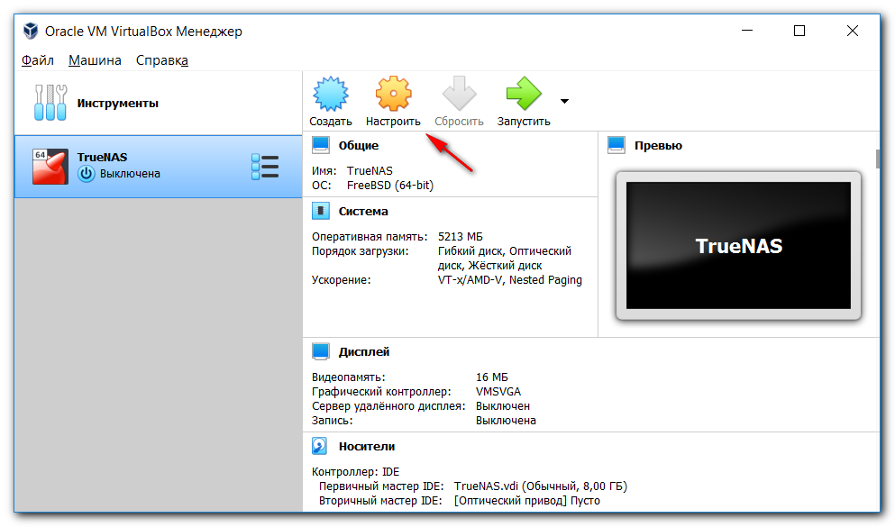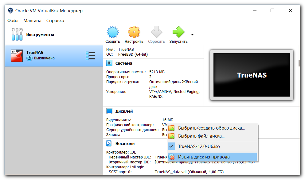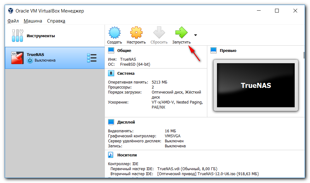 Рассмотрим пример установки TrueNAS CORE на программный продукт виртуализации VirtualBox в Windows.