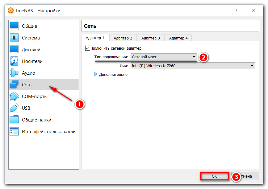 - СЕТЬ: используем мост. Этот режим является оптимальным, поскольку при этом сетевая карта обрабатывается так, как если бы она была подключена к простому коммутатору в существующей сети.
