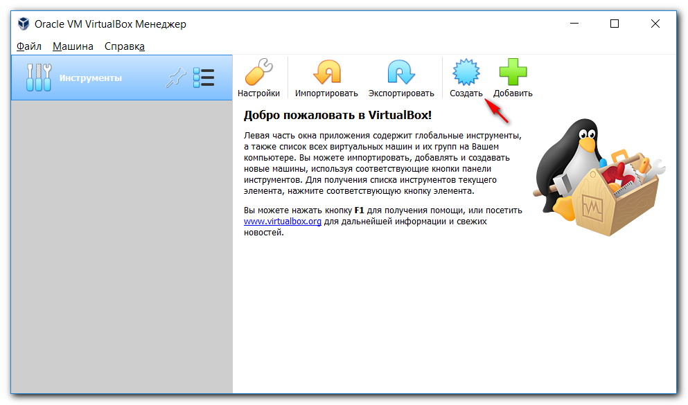 Запускаем VirtualBox и создаем новую виртуальную машину (ВМ):