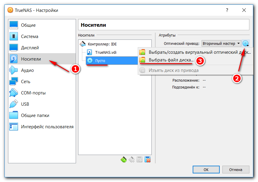 Добавим в оптический привод сохранённый ранее загрузочный образ TrueNAS CORE.
