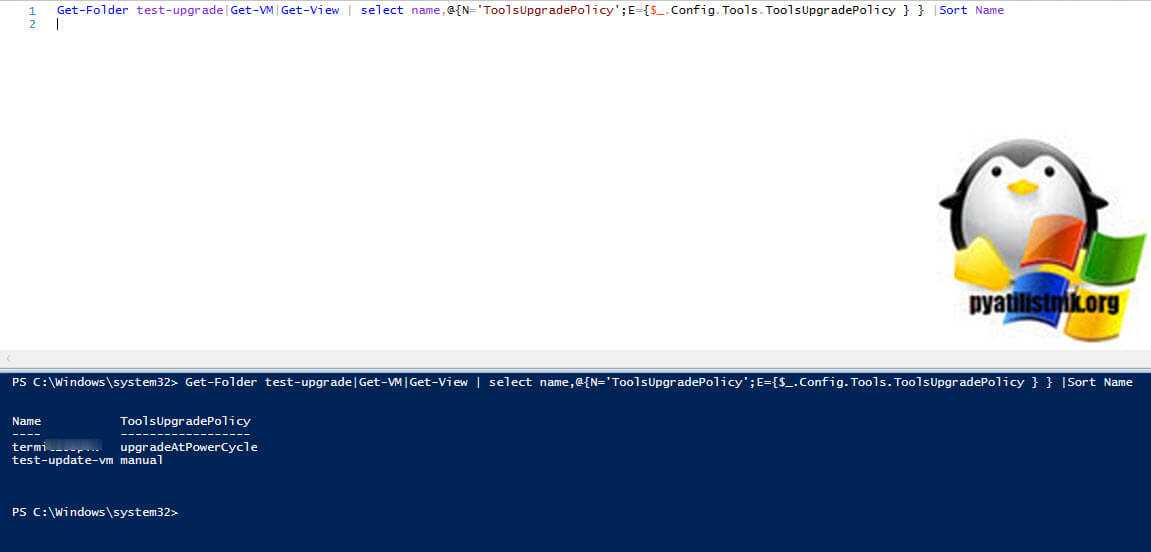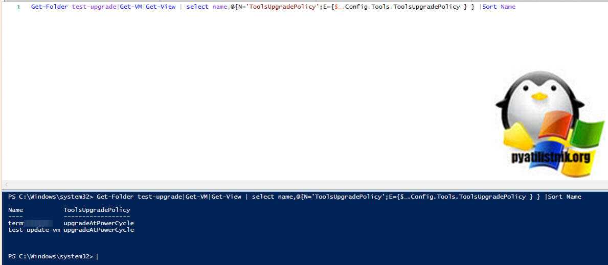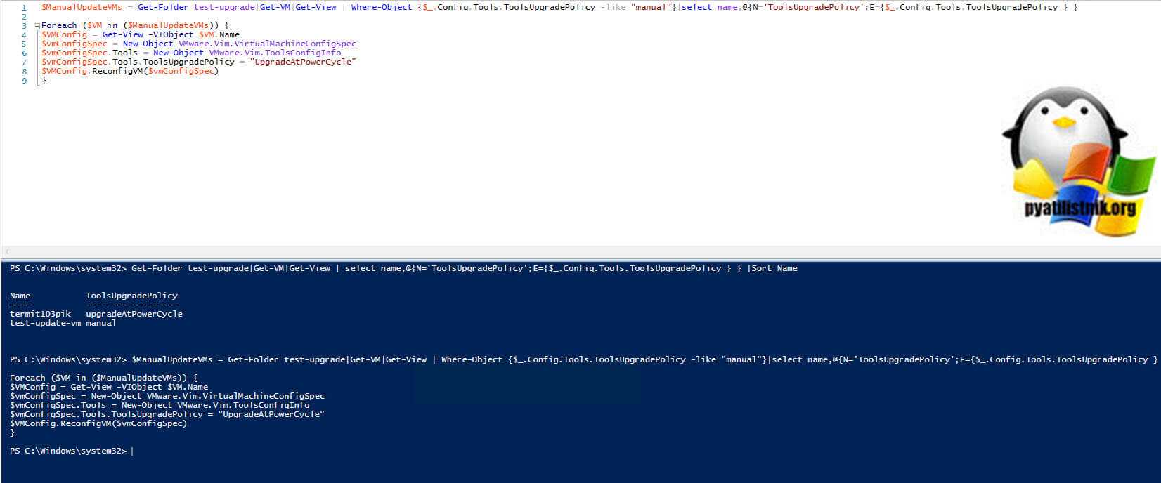 $ManualUpdateVMs = Get-Folder test-upgrade|Get-VM|Get-View | Where-Object {$_.Config.Tools.ToolsUpgradePolicy -like «manual»}|select name,@{N=’ToolsUpgradePolicy’;E={$_.Config.Tools.ToolsUpgradePolicy } }