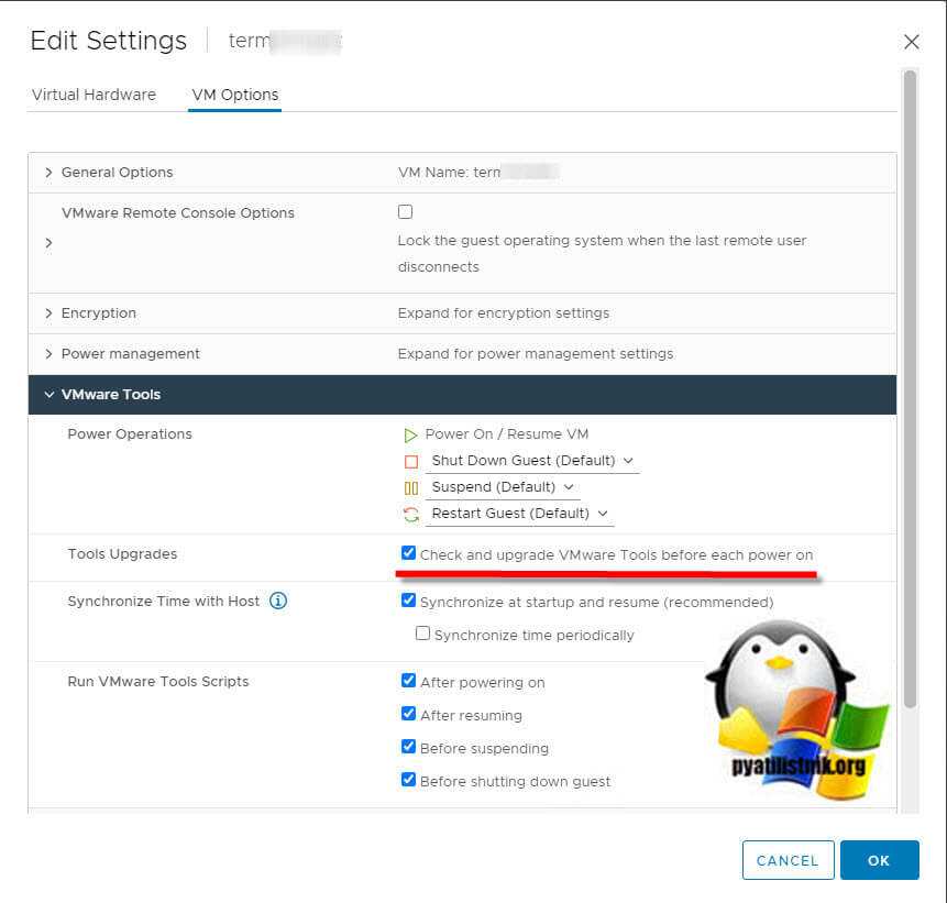 Использование параметров виртуальных машин для обновления VMware Tools, также является еще одним методом автоматического обновления оборудования у виртуальных машин. Включение расширенного параметра “Check and upgrade VMware Tools before each power on” нельзя использовать из-за дополнительной перезагрузки виртуальных машин. Помните, что с Windows Server 2016, VMware Tools больше не требует перезагрузки при обновлении, можно безопасно включить этот параметр, и виртуальные машины будут обновляться при каждой перезагрузке. Однако это может быть применимо не ко всем ситуациям, поэтому еще одна рекомендация — включить это для лабораторной среды или некритических рабочих нагрузок. Самый простой способ включить эту опцию — войти в vSphere Client, отредактировать настройки виртуальной машины и включить настройку.