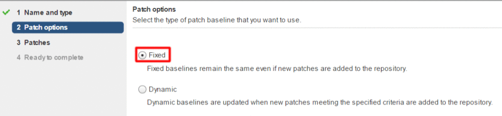 Затем нужно выбрать тип патча в бэйзлайне. В терминологии динамические бэйзлайны обновлений содержат набор патчей, которые автоматически применяются при наличии нового патча и соответствия его указанных вами критериям. Фиксированные бэйзлайны (Fixed baselines) содержат только указанные вами обновления, не зависимые от того, имеются ли более новые патчи или нет.