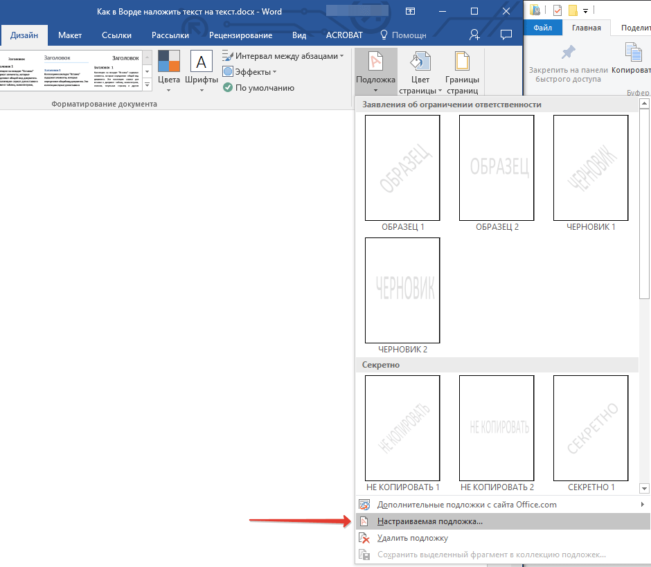 3. Выберите в развернувшемся меню пункт “Настраиваемая подложка”.
