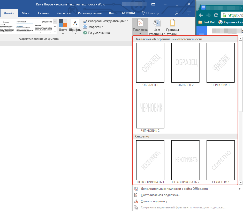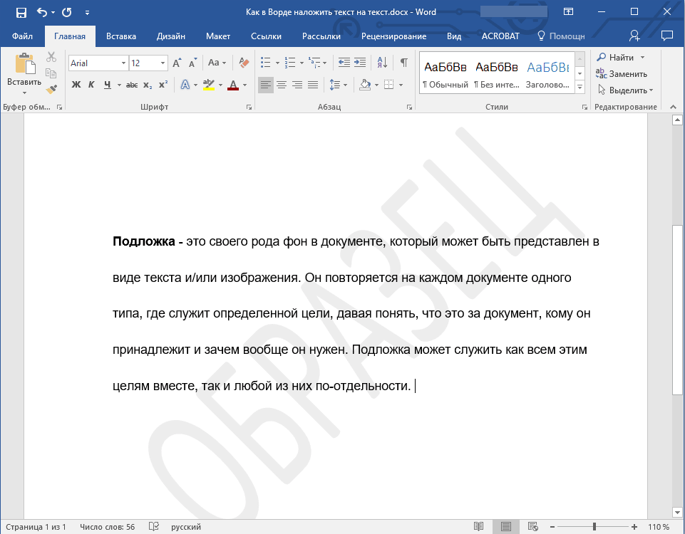 MS Word тоже позволяет добавлять подложки на текстовый документ, поверх которых и будет располагаться основной текст. Таким образом вы можете наложить текст на текст, добавить эмблему, логотип или любое другое обозначение. В Ворде имеется набор стандартных подложек, также вы можете создать и добавить свою собственную. О том, как все это сделать, и пойдет речь ниже.