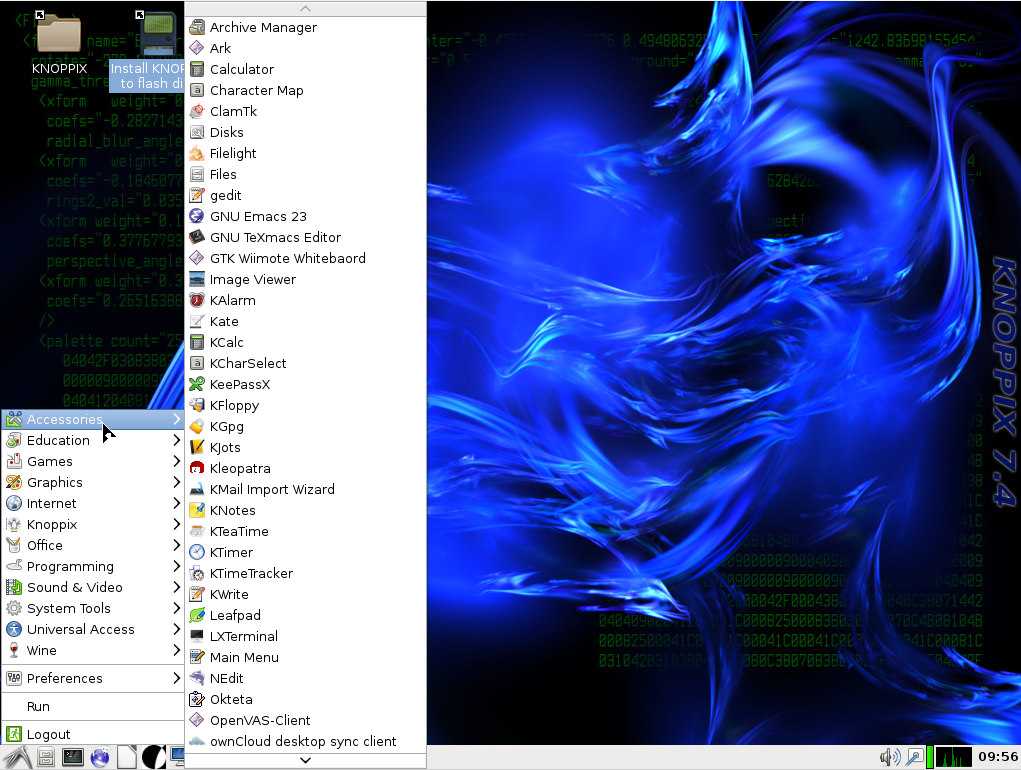 ClamTK, Emacs, Kate, Gedit, KeePassX, KGpg, LeafPad, ownCloud desktop sync client, Time Tracker, GCompriss (интерактивная обучалка для детей, игры), KAlgebra, KGeagraphy, KLetters, KStars, SciLab, 50+ games, Dia, Gimp, Inkscape, KRuler, KSnaphot, LibreCAD, Simple Scan, Okular, XSane, Chromium, Ekiga soft phone, IceDove, KGet, KTorrent, LinPhone, Pidgin, Remmina, Transmission, Vidalia, WPA GUI, XChat, GPRS/UMTS Connect, Knoppix Firewall, Samba Server, SSH Server, Tor Proxy, Bitcoin, Dictionary, KMail, KOrganizer, Libre Office Suite, BlueFish Editor, Eclipse, Geany, phpMyAdmin, QT4 studio, Amarok, Audacity, K3B, Me TV, Minitube, OpenShot video editor, SMPlayer, Sound Juicer, WinFF, VLC, Disk Usage Analyzer, KSysGuard, System Monitor, VIrtualBox, DosBox, Wine…