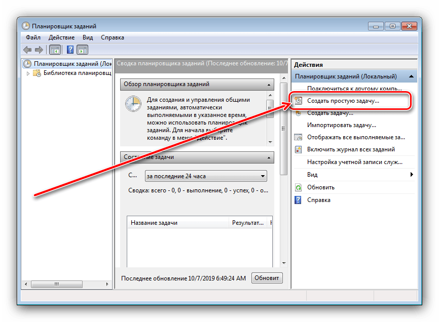 Подождите, пока оснастка загрузит всю нужную информацию, после чего в меню справа задействуйте пункт «Создать простую задачу».