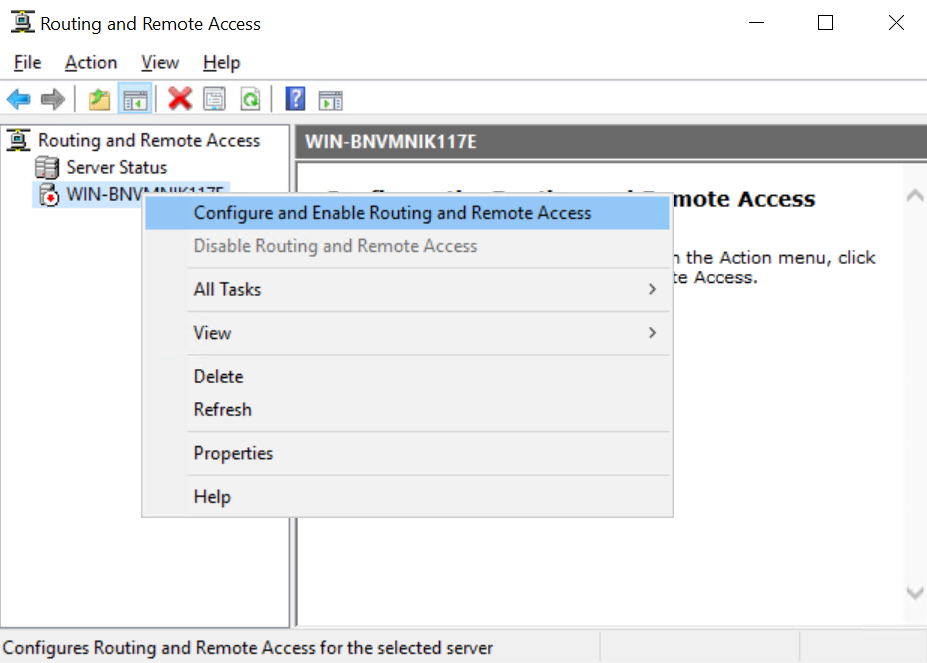 - Правой кнопкой на имени сервера, далее «Configure and Enable Routing and Remote Access»