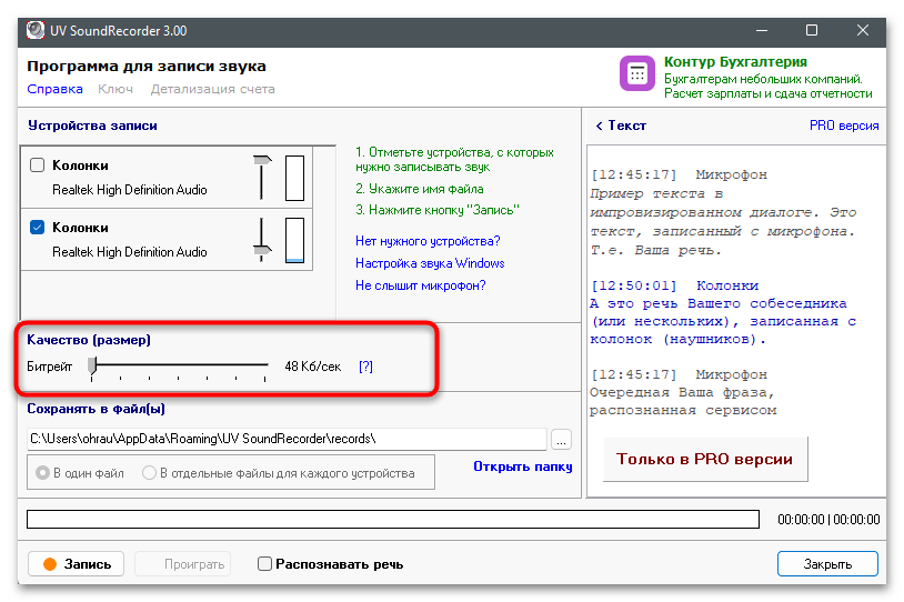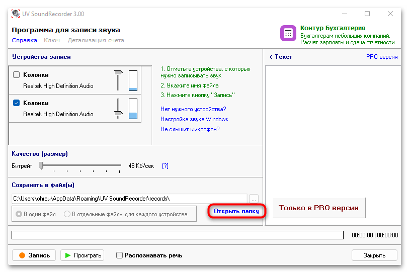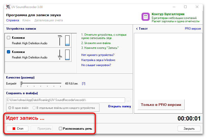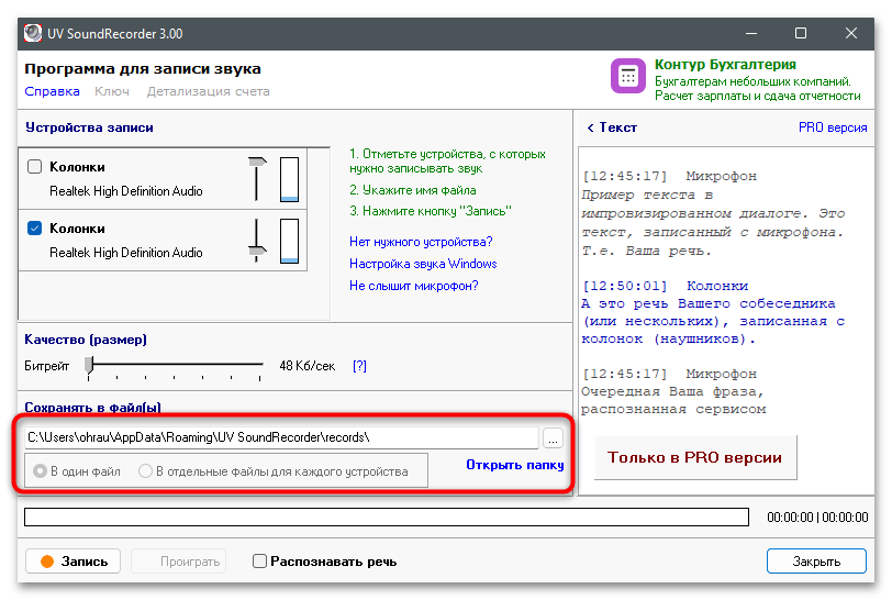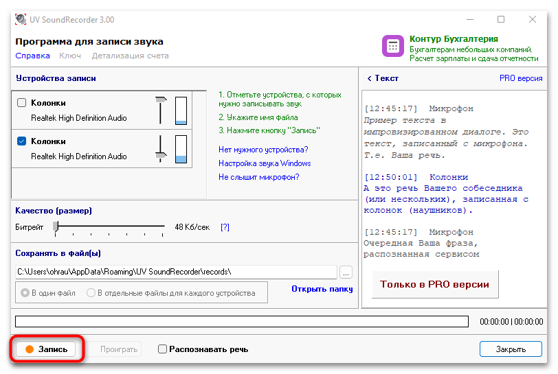 - Скачайте и установите бесплатную версию UV SoundRecorder на свой компьютер. После запуска убедитесь в том, что колонки и микрофон отображаются корректно в списке устройств записи. Активируйте динамик для того, чтобы в записи был слышен собеседник, а микрофон — для сохранения собственных реплик.