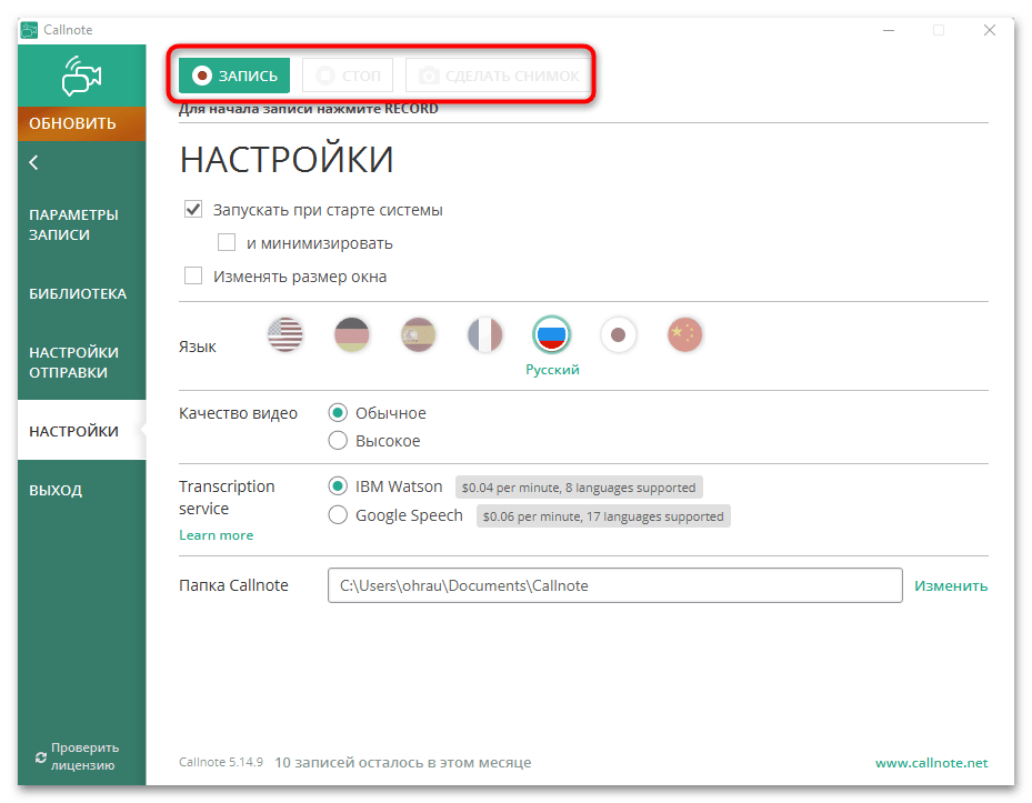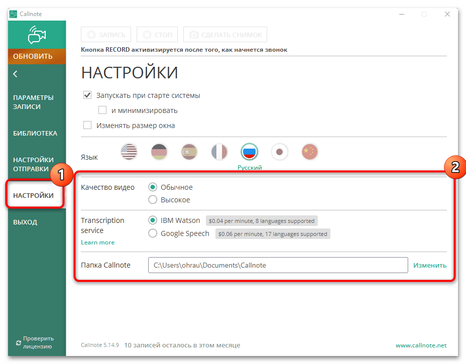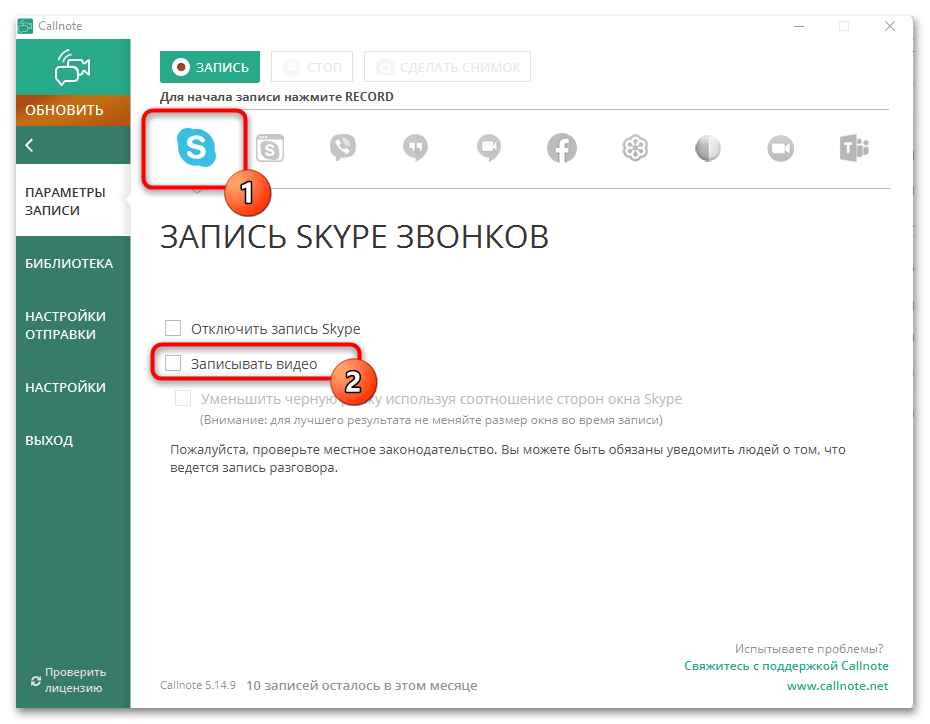Есть много разных программ, позволяющих захватывать видео с экрана вместе со звуком, что и позволяет сохранить разговор из Скайпа, однако в рамках данной статьи предлагаем остановиться на Callnote. Это решение нацелено на то, чтобы записывать именно звонки, предоставляя пользователю соответствующие настройки. Ее бесплатной версии хватит на 10 записей в месяц, чего вполне достаточно обычному юзеру.