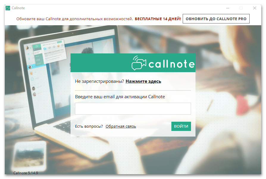 Введите указанный при скачивании электронный адрес, чтобы активировать Callnote и начать взаимодействие с софтом.