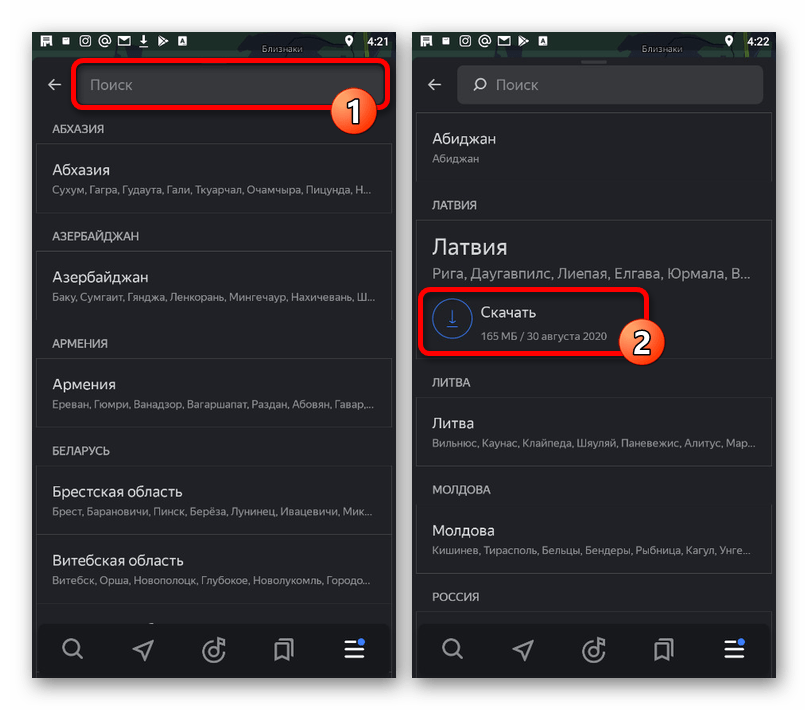 Если помимо карты выбранного по умолчанию региона вы хотите загрузить и другие места, будет достаточно тапнуть по блоку «Поиск», выбрать в списке нужный вариант и воспользоваться кнопкой «Скачать». Добавление в таком случае происходит точно так же, как было указано выше.