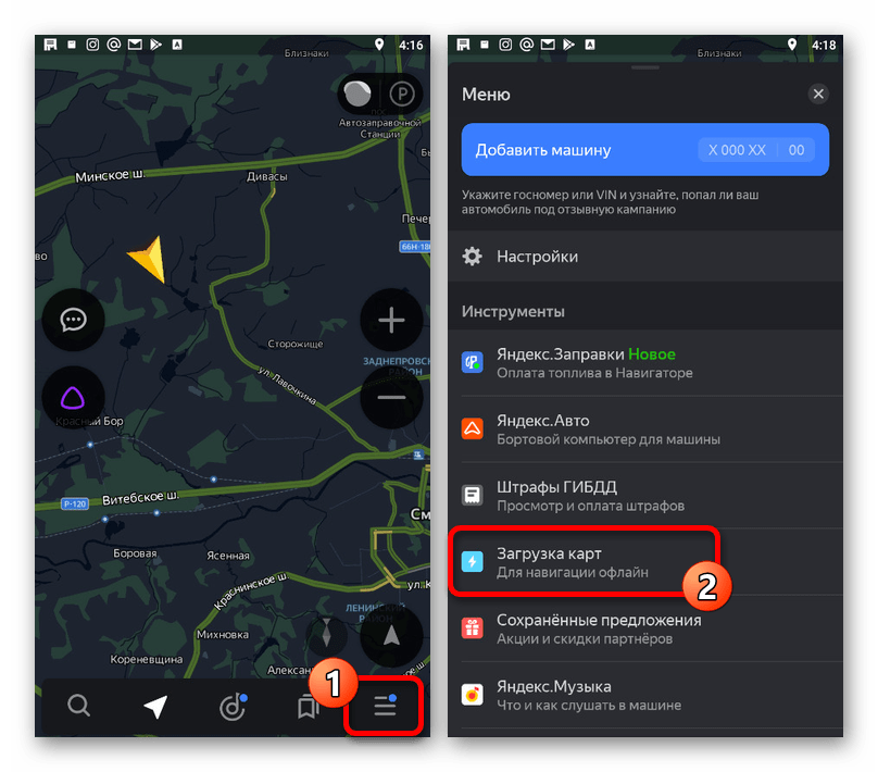 - Откройте рассматриваемое приложение и на нижней панели нажмите по нижнему правому значку. После этого через основное меню необходимо перейти в раздел «Загрузка карт».