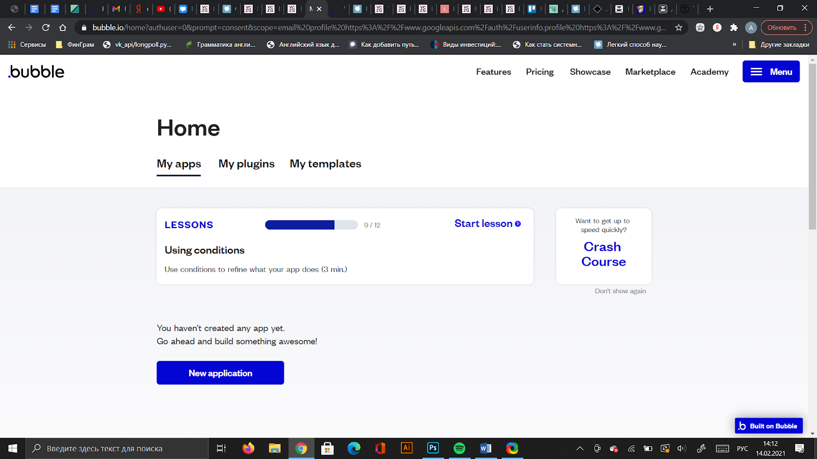После успешной авторизации нас приглашают познакомиться с интерфейсом и возможностями Bubble. Для этого платформа предлагает пройти короткий курс. Он полностью на английском, но пусть это вас не смущает: с переводчиком все инструкции будут понятны.