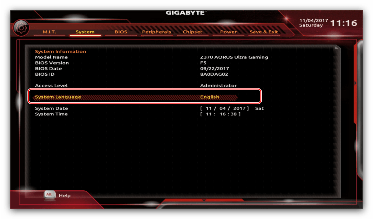 В последние годы производители материнских плат всё чаще используют UEFI BIOS, с графическим интерфейсом и поддержкой мыши как более удобный и комфортный. Этот вариант нередко имеет в себе возможности переключения языка интерфейса. Также подобные настройки есть в некоторых «классических» БИОСах. Рассмотрим процедуру на примере UEFI материнской платы Gigabyte, для других вариантов операция не слишком отличается.