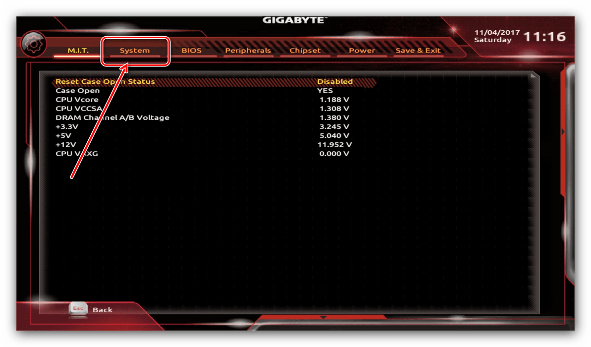 - Далее требуется найти системные настройки микропрограммы. В рассматриваемом примере они расположены во вкладке «System», на которую и следует перейти.