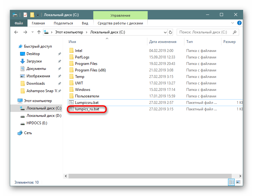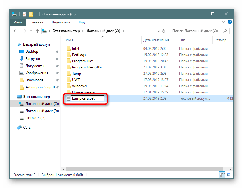 Впишите команду , где copy con — команда, которая создаст текстовый документ, c:\ — директория сохранения файла, lumpics_ru — имя файла, а .bat — расширение текстового документа.