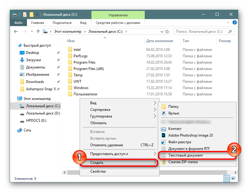- Вы также можете сразу открыть директорию, куда планируете сохранить файл, нажать по пустому месту правой кнопкой мыши, навести на «Создать» и из перечня выбрать «Текстовый документ».