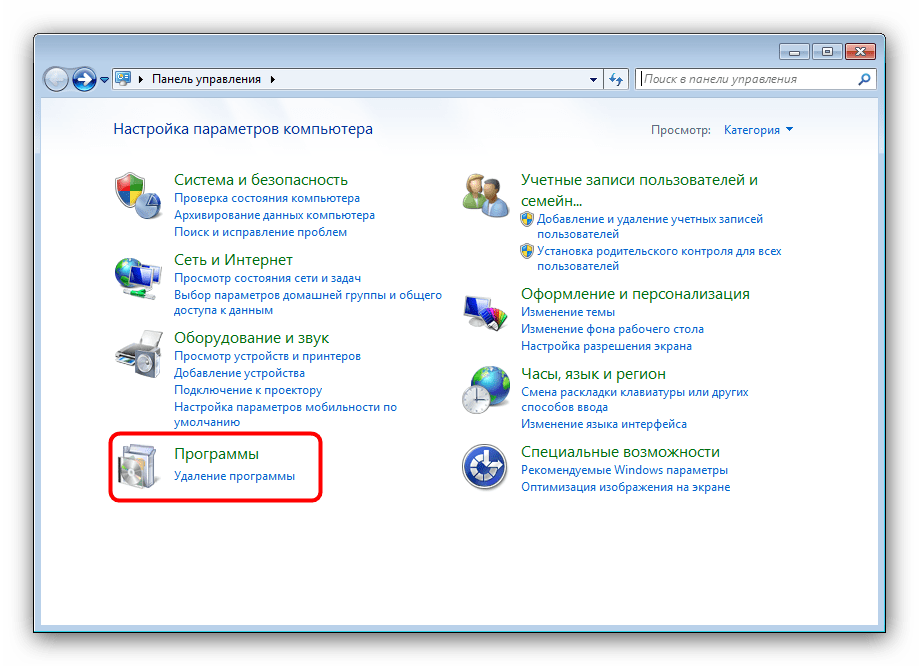В «Панели управления» найдите пункт «Программы», в котором выберите вариант «Удаление программ».